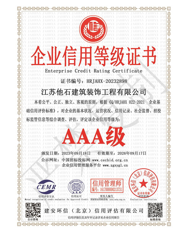 江蘇他石建筑裝飾工程有限公司成立于2007年,經過多年的發展積累,已發展成為一家以建筑裝飾設計和施工為主體,融電子與智能化、消防設施、房屋建筑、特種工程、展覽館設計與施工等為一體的專業化建筑企業,是江蘇省裝飾協會會員單位、淮安市裝飾協會副會長單位、淮安市建筑業協會會員單位、中國展覽館協會會員單位。